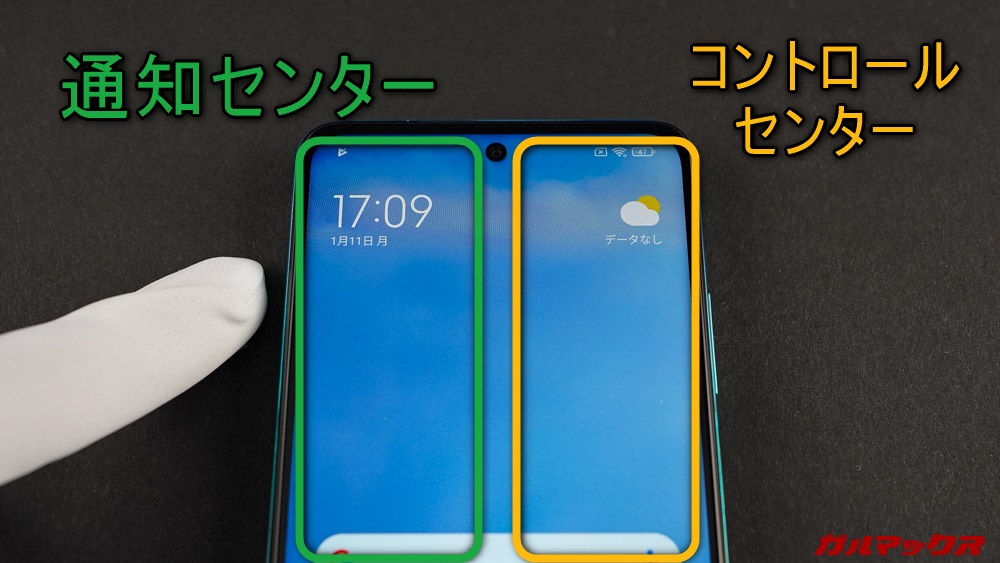 通常のAndroidOSでは「画面上部から下にスワイプすると通知センターが開く」挙動ですが、MIUI 12では新たに「通知と設定項目を分離させる」ということが出来るようになりました。早い話、iOSと同じような挙動を見せます。