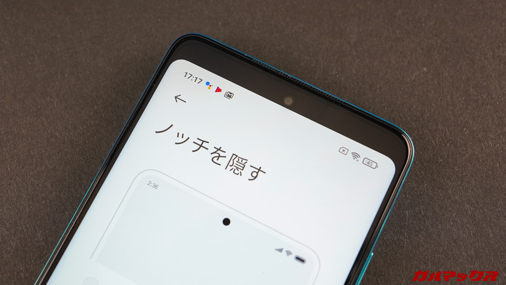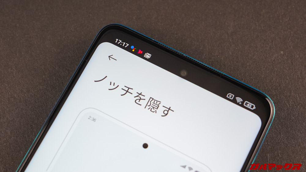 M字ハゲと揶揄される水滴ノッチやパンチホールといった「画面欠け」がイマイチだなと思うユーザーさんに嬉しいのがノッチ隠しの機能。MIUI 12はしっかり隠せます。