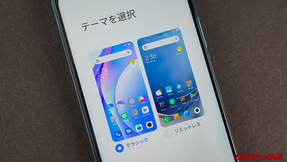 ▼デフォルトでMIUI 12にはテーマが2つ入っています。一般的な「クラシック」と、昔のAndroidを彷彿とさせるスタイルの「リミットレス」。↓
