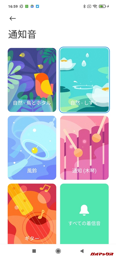 ▼これだけだと他の独自OSにも言える部分ですが、MIUI 12ならではな部分として「鳴動するたびに音が変わるプリセット通知音」が存在します。デフォルト音の「しずく」では、通知がなるたびに「ピチョン」「モッ」「ポ」と異なるしずくの音を奏でるんす。↓