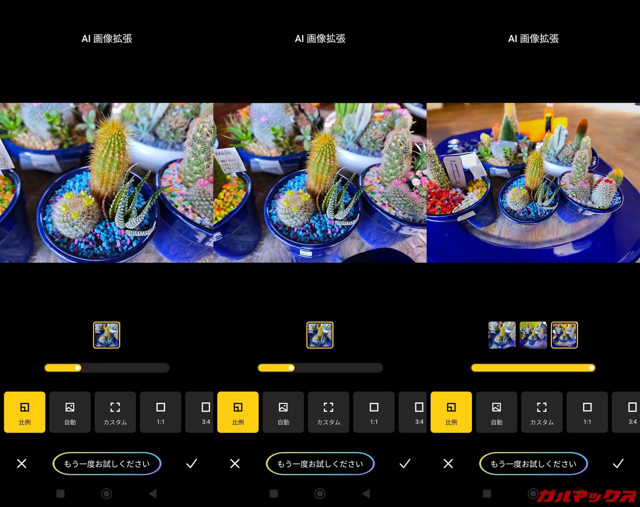 ▼個人的にビックリしたのがAI拡張機能。これは元の写真から拡張して新たな写真を作れる機能なんですが、このレベルで拡張できます。一番左が元の画角です。↓