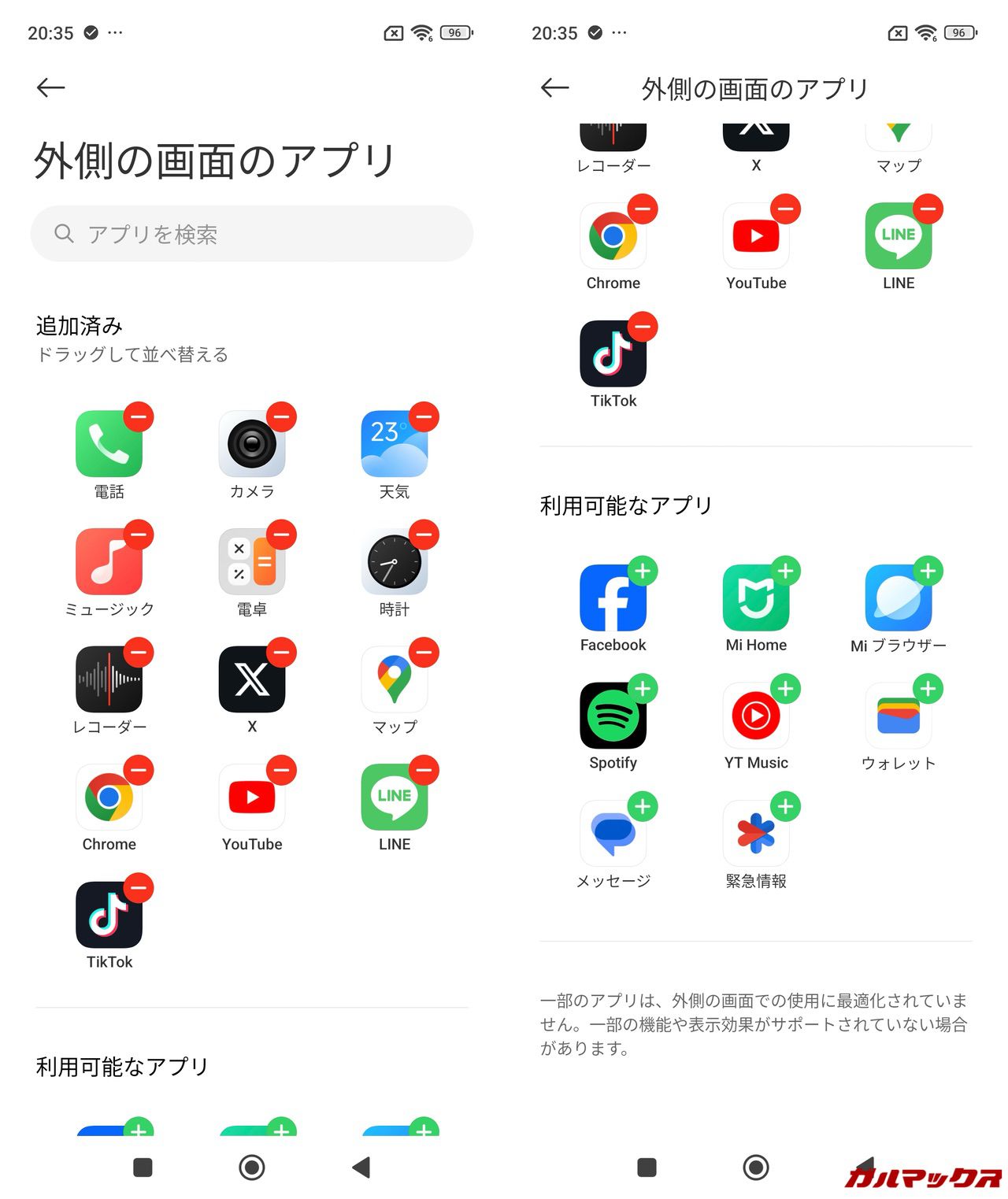 てっきり、何でもサブディスプレイで使えるのかと思っていましたが、アプリを入れて上の画面に表示されるアプリのみサブ画面に追加できるようです。たとえばChatworkアプリはアイコンが出てこず使えませんでした。残念。