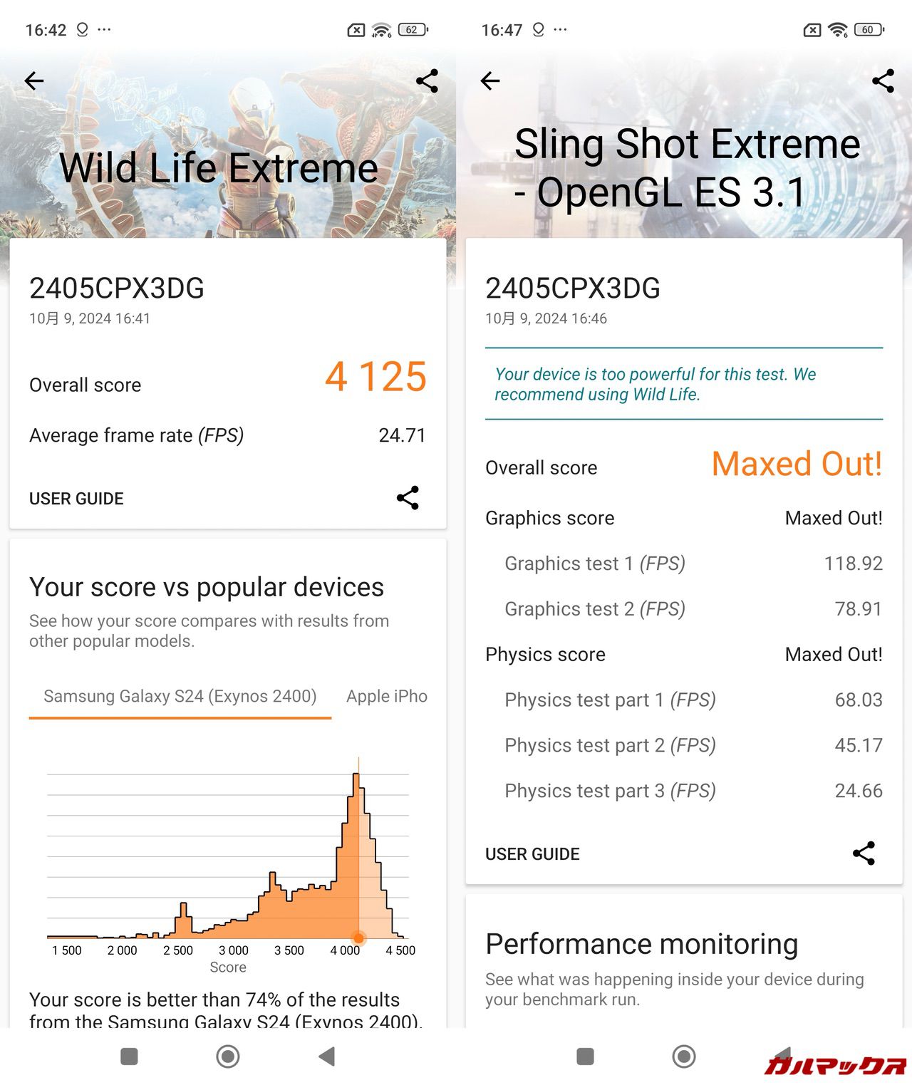 他のSnapdragon 8 Gen 3搭載機だと同じ条件で60FPS張り付きということも珍しくないので、Xiaomi MIX Flipは踏ん張りが少々弱い印象です。