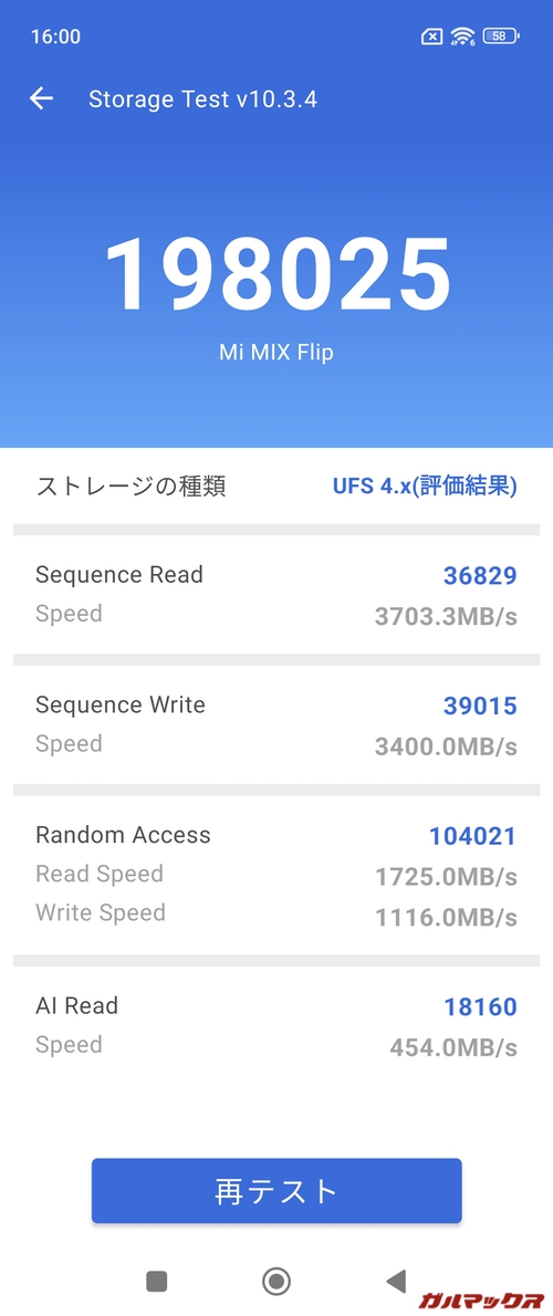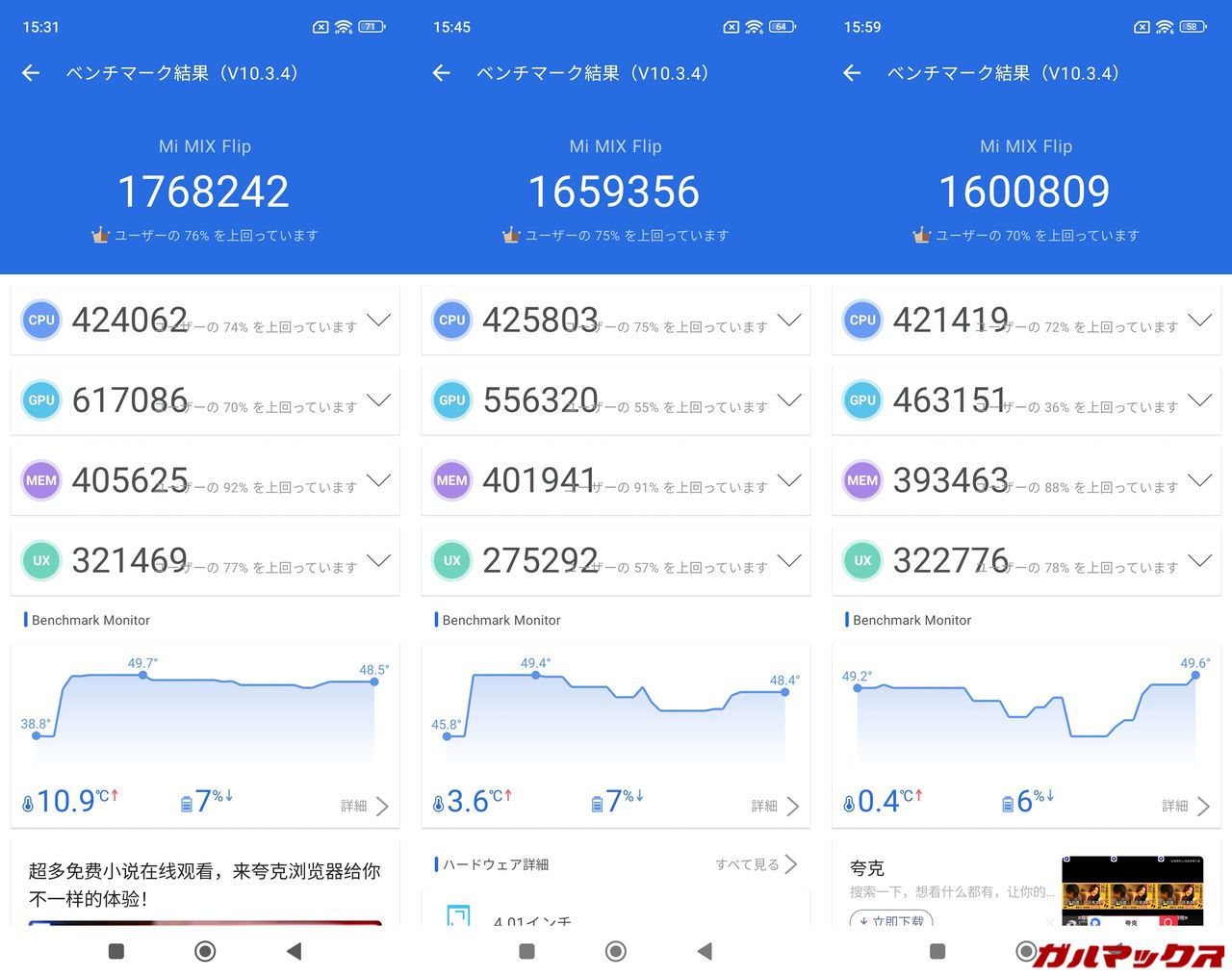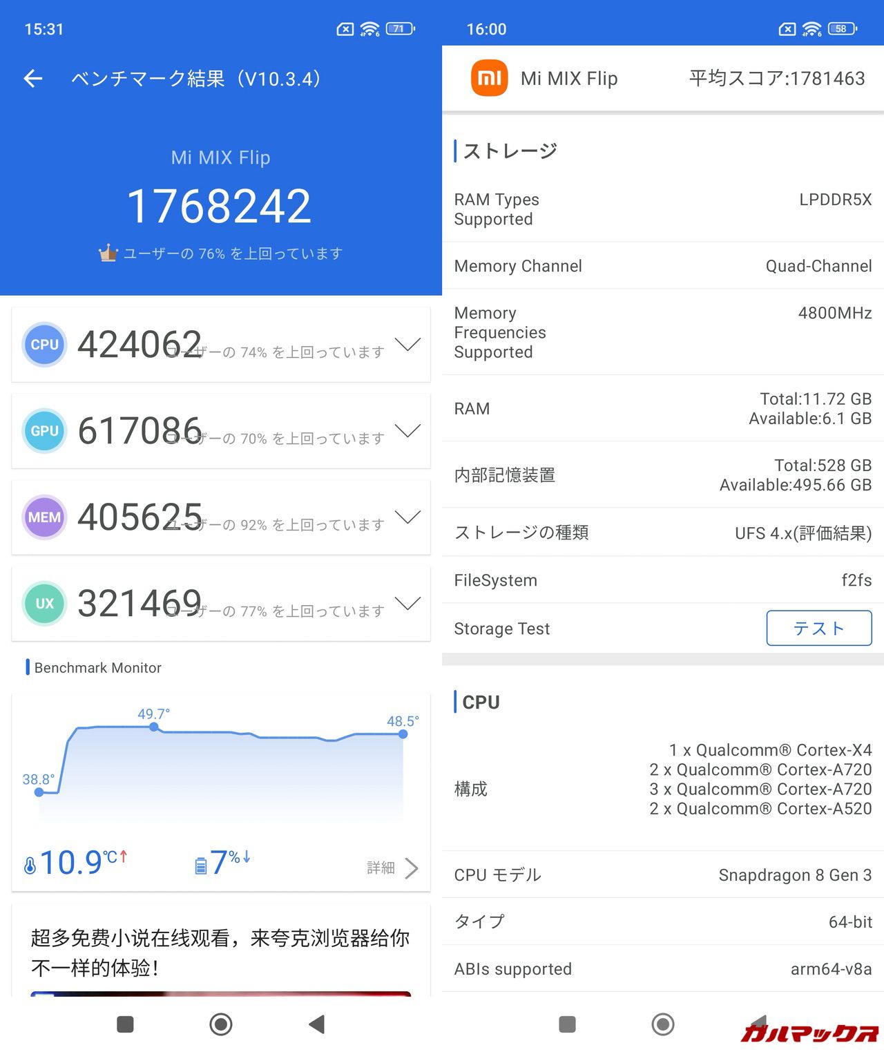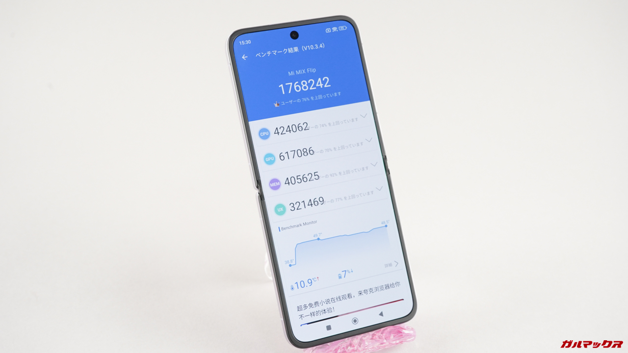 ただSnapdragon 8 Gen 3は総合スコア200万点を超える製品も多いので、Xiaomi MIX Flipのスコアを見ると性能を絞ってサーマルスロットリングを出来るだけ発生させないようなチューニングをしているのかな?と思わせるようなスコアでした。