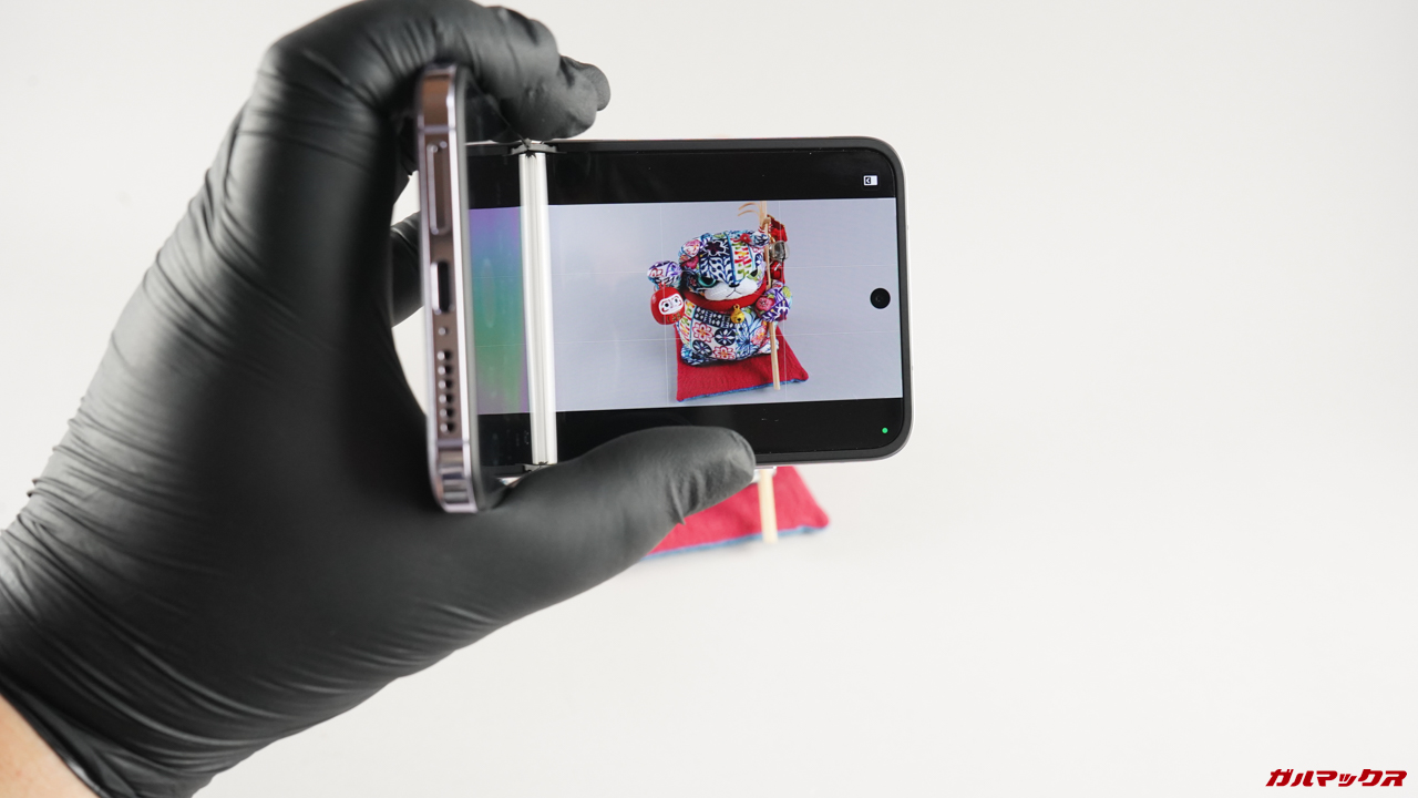 ▼カメラアプリでは上側にファインダー、下側に操作パネルが表示されるようになってます。こんな感じで動画をハンディカムのような持ち方で撮影できますよ。ただ、ヒンジがロックされる訳ではないので、動きながらの撮影には向いてません。↓