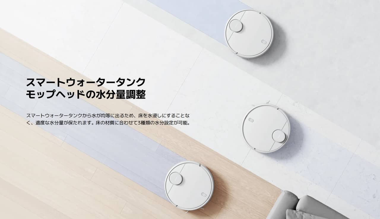 Xiaomi ロボット掃除機 S10の場合3段階での水分調節に対応しています。床の材質や状況に応じてカスタマイズ可能。
