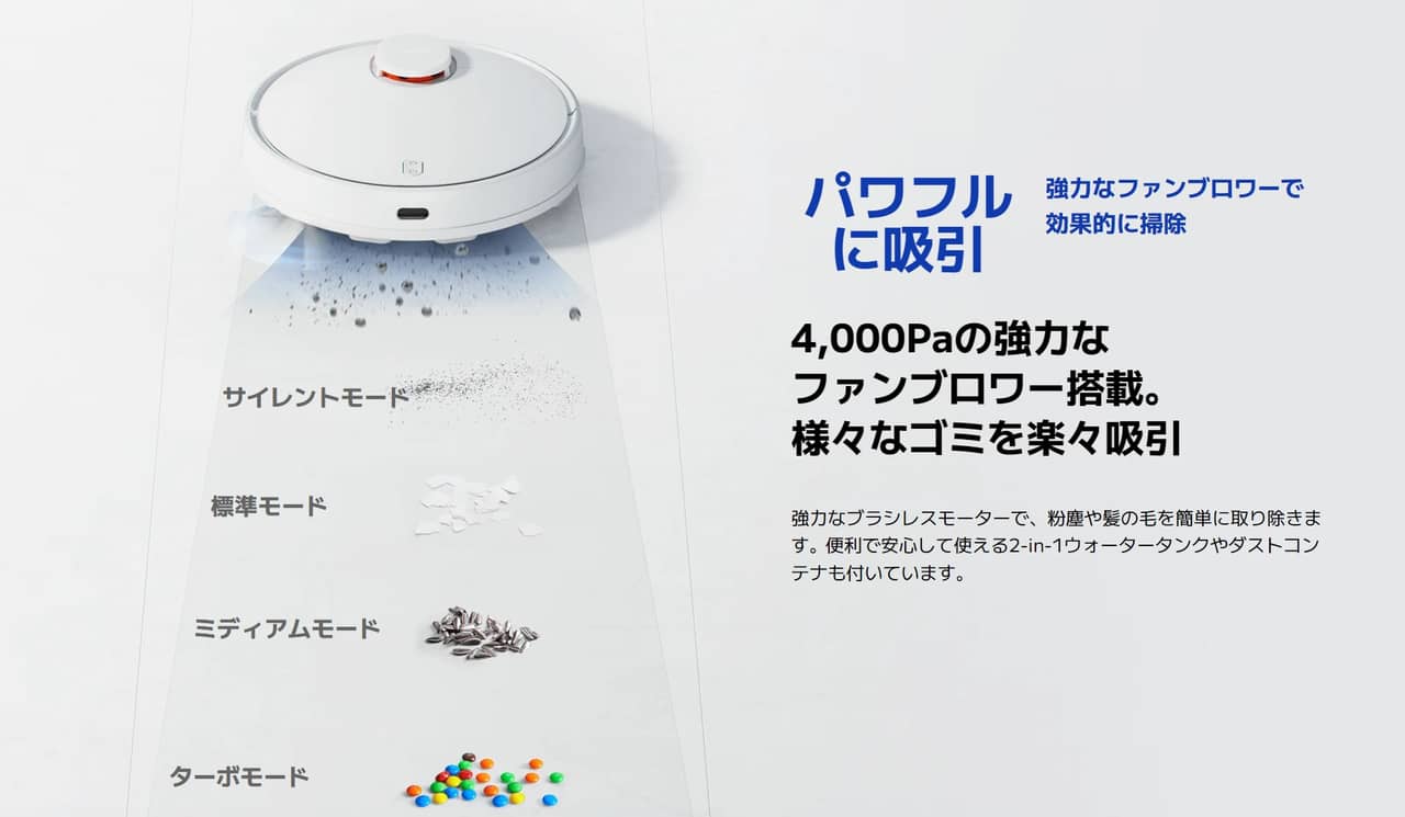 ▼吸引力は最大4,000Pa。高級ハイエンド(大体5,000Paあたり)に比べれば劣るものの日常仕様においては十分な印象。サイレント、標準、ミディアムとターボの計4段階の吸引力切り替えに対応します。つーか標準とミディアムっておんなじなんじゃ‥↓