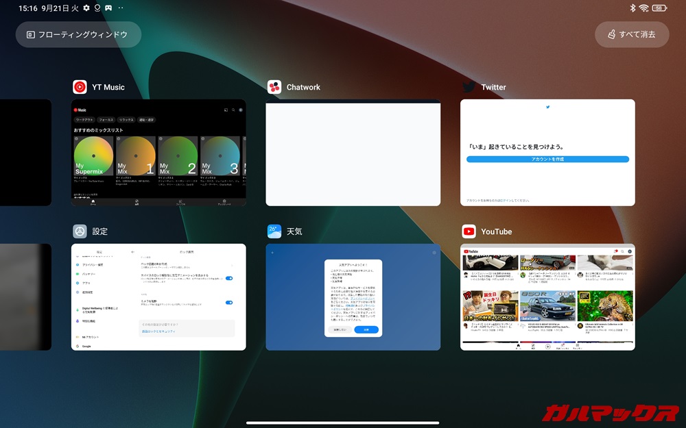 ▼アプリ履歴画面も独自のタイプで、アプリがタイル状に並びます!より多くのアプリが一度に出てきてくれるため大画面なタブレットとの相性抜群!マルチタスクが捗るぜ!↓