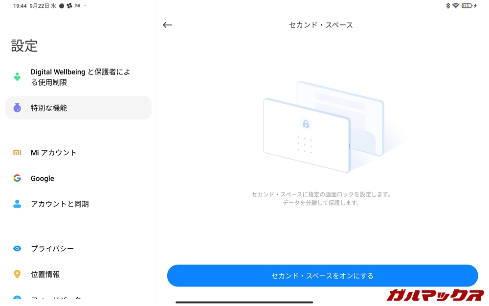 通称浮気モードことセカンド・スペースも搭載しています。この機能はパソコンでいうマルチユーザー機能。個人用と仕事用、家族用と子供用とで完全に分けることができます!
