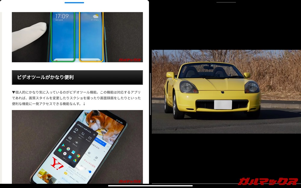 ▼YouTubeはフローティング表示ができませんでしたが分割画面は使えるので、こんな具合で動画を見ながらの「ながら作業」がすごくはかどります(`・ω・´)。画像は、左側はブラウザで右側はYouTubeの全画面再生状態です。↓