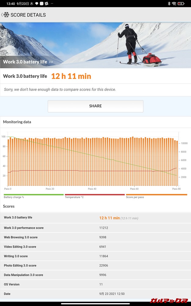 ▼PCMarkでバッテリーテストも行いました!結果は12時間11分!