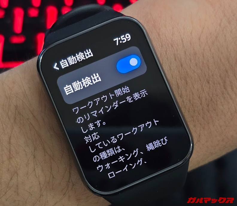▼測定をしていなくても体を動かしていれば自動で検出して測定を開始してくれる自動検出機能も対応。ランニングやサイクリングなど各種に対応しているのも良い!↓