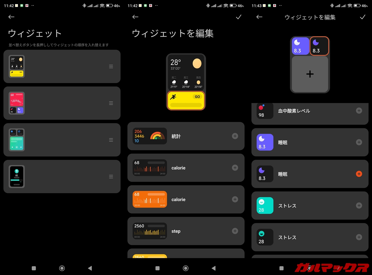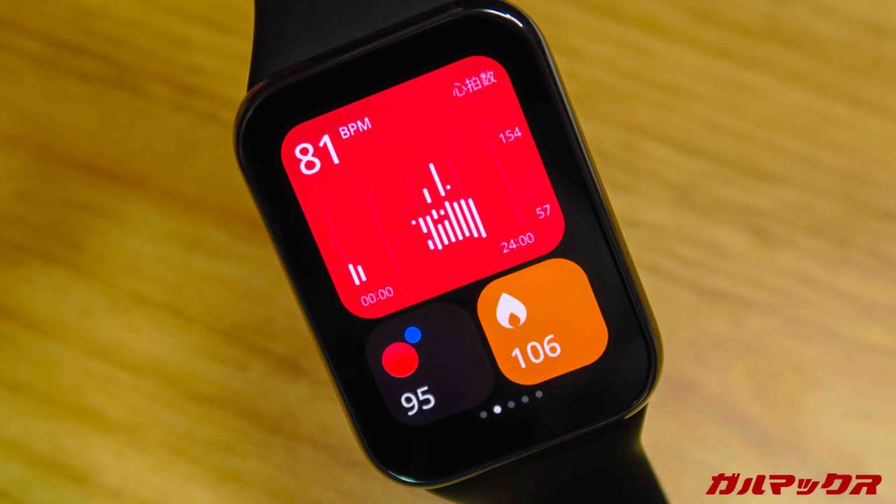 Xiaomi Smart Band 8 Pro特有の利点の1つにウィジェット機能があります。待受を左右にスワイプすると出てくる画面で、心拍数とか睡眠時間とか天気予報とかが出てくるアレです。