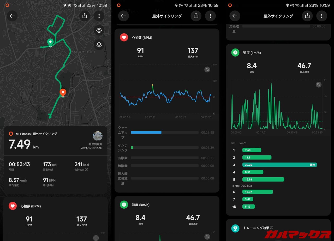 ▼スマホアプリ側でも運動のリザルトが見られます。走った距離や速度などのペース配分やマップの確認も可能。↓