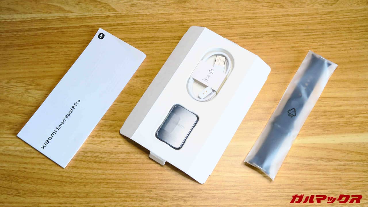 ▼Xiaomi Smart Band 8 Proの付属品はこんな感じでした!やはりクイックガイドと充電器のみ。なお最初の状態だと、本体とバンドは分離しています。↓