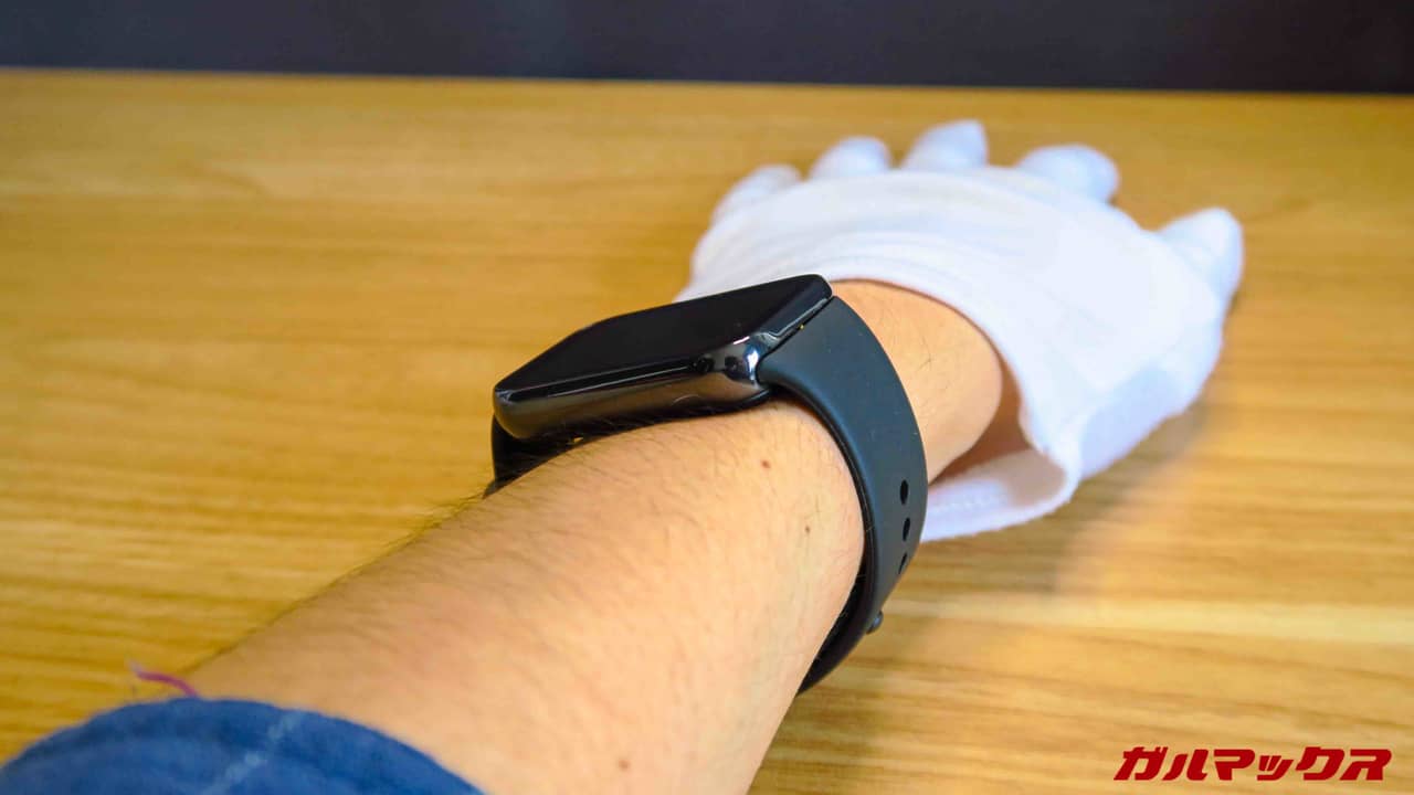 ▼装着したらこんな感じ。サイズは大きめではあるけど厚みが抑えられており重さも感じず、装着感はいい感じ!流石にこれより細長い無印Smart Band 8とSmart Band 8 Activeには負けるけど。↓