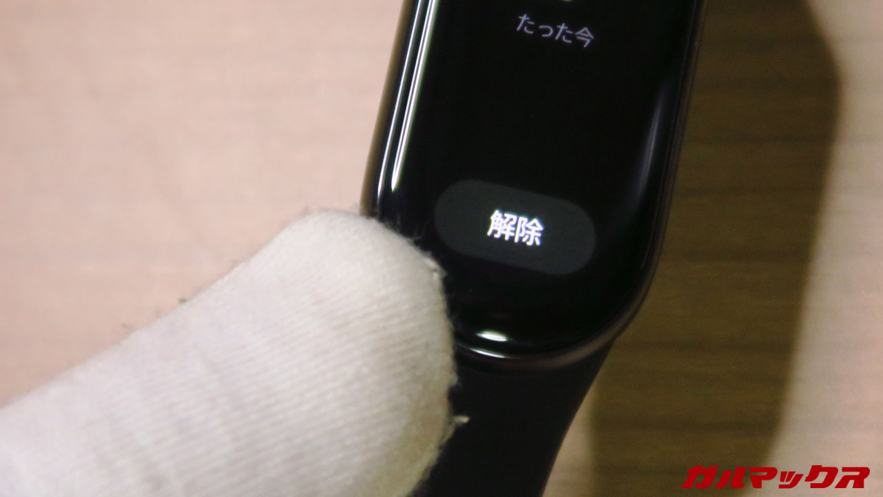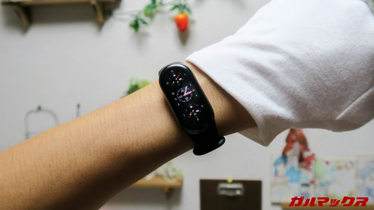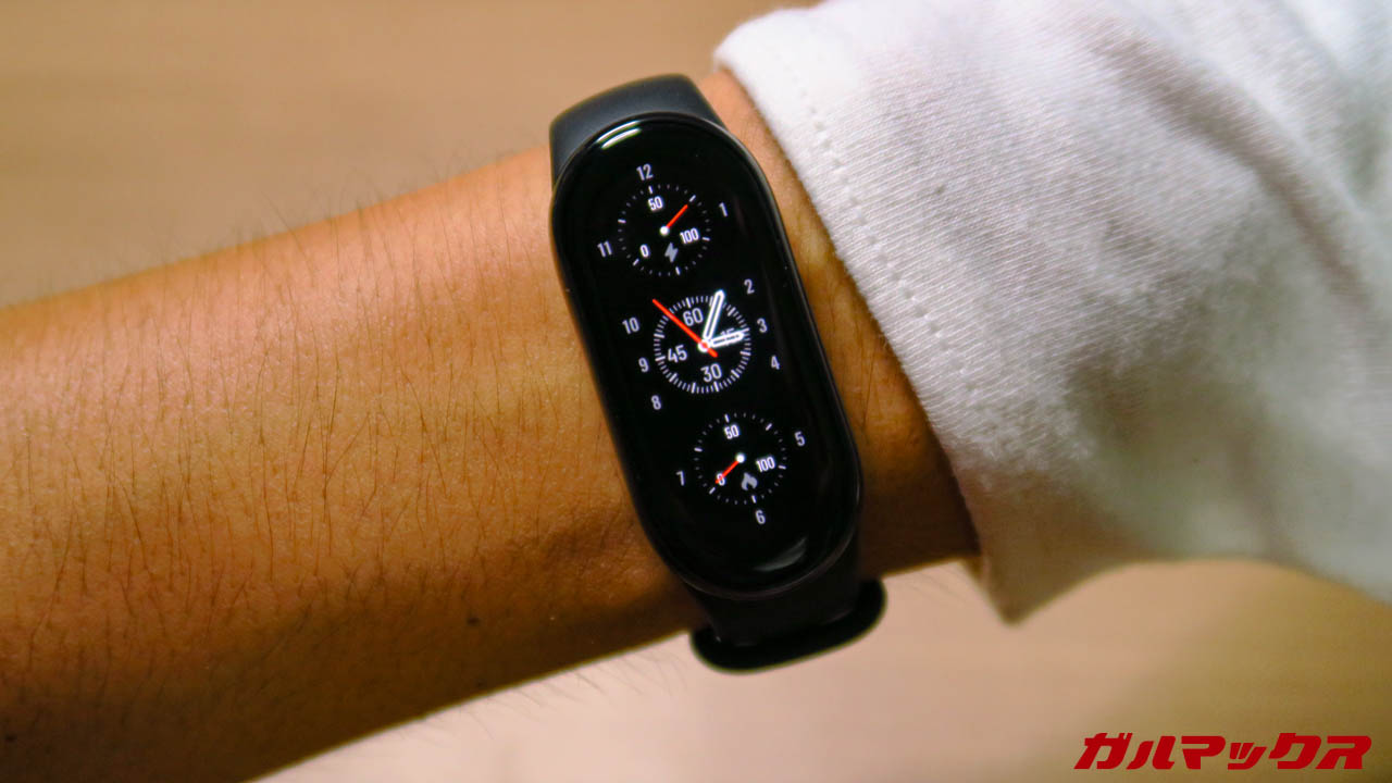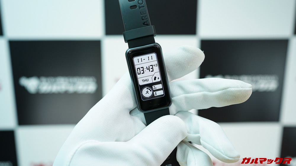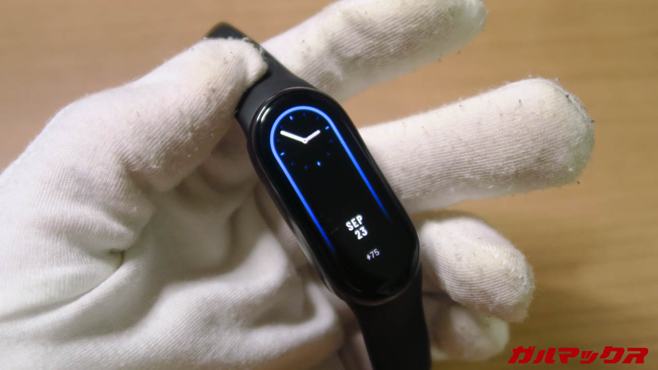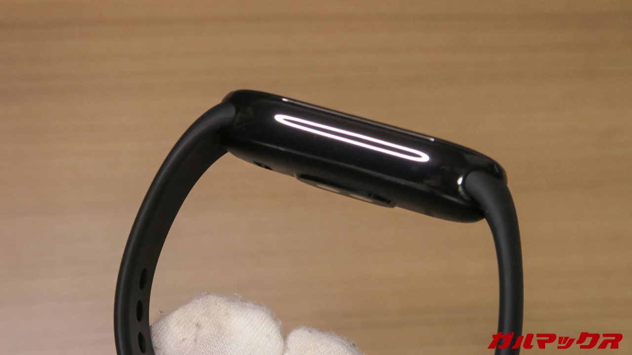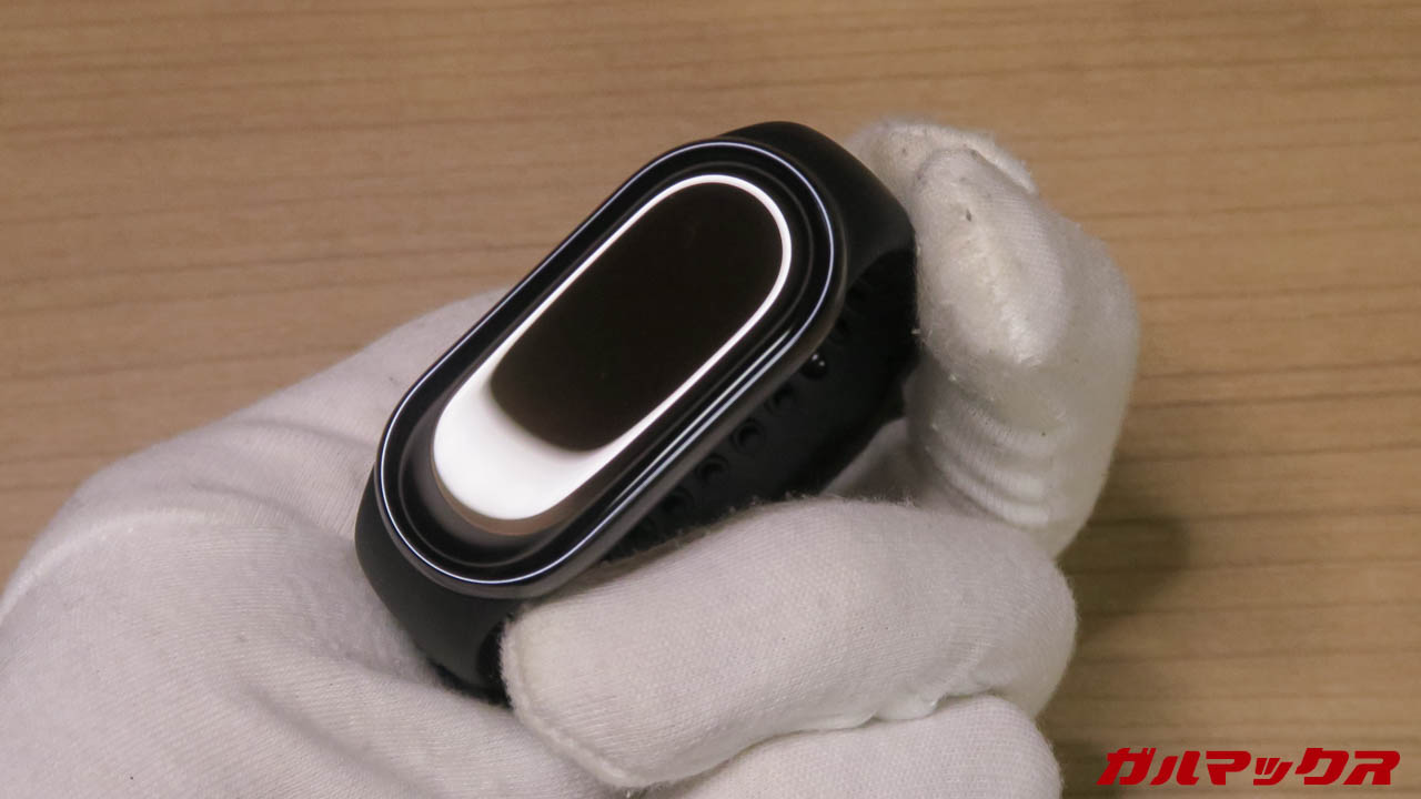 あくまで目視ではあるんですが、これまで触ってきたスマートバンドの中ではかなり厚めですね。ぶつけないよう注意したいところ。見た目が良いからなおさら傷つけたくないし。