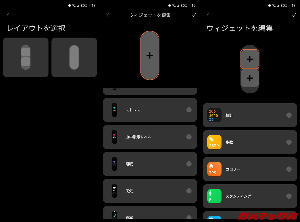 ▼文字盤によっては、長押しすることで内容のカスタマイズも可能!色を変えたり、歩数や運動時間や起立回数など変えられます。↓