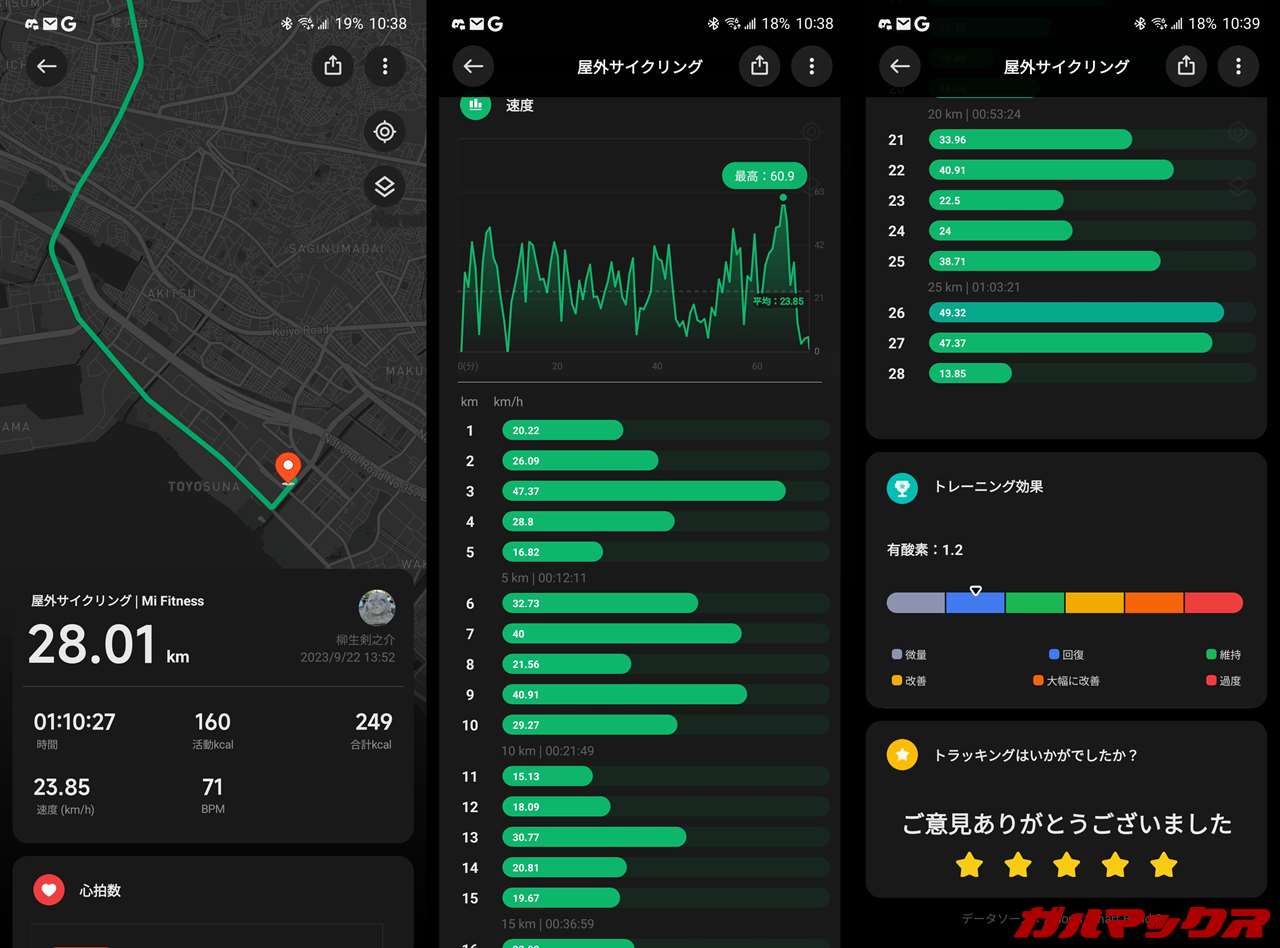 ▼測定してみたらこんな感じ。スマホ上のGPSを用いてルートも記録するほか、サイクリングの場合は距離1キロにおける平均速度もグラフ化しています。↓