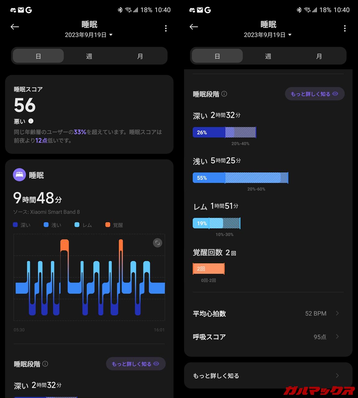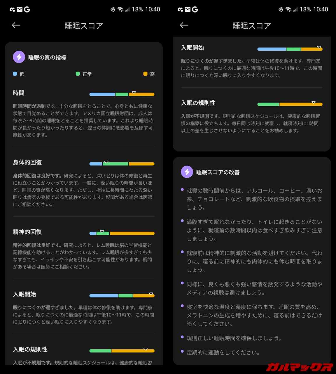 ▼睡眠時間の測定もバッチリ。眠りについた時間も睡眠時間も、途中起きた時間もしっかり合ってました。時間によって昼寝判定されるとかそういうわけわからん現象ありません。睡眠スコア判定は悪いんだけど‥合ってるから反論できん。↓