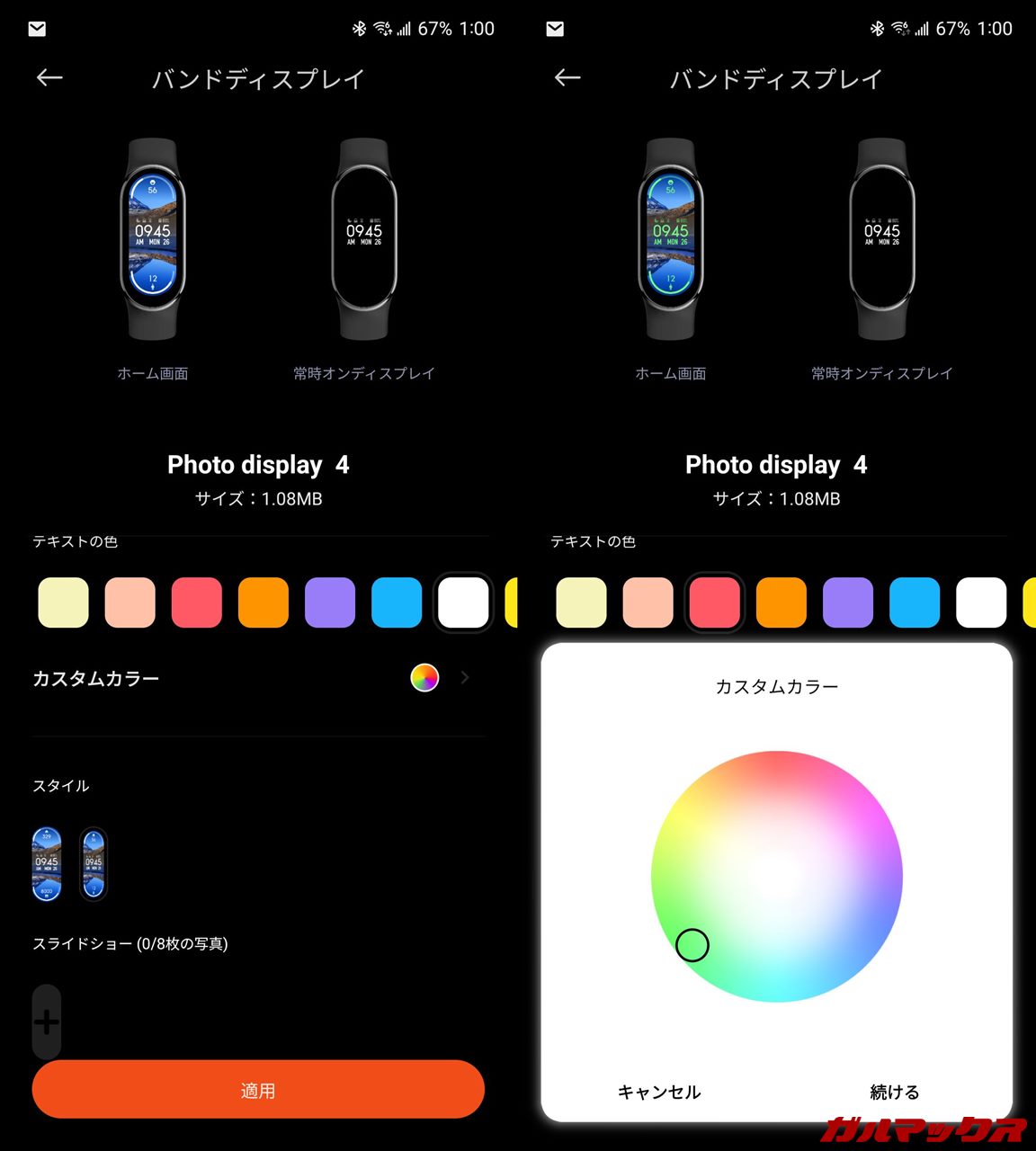 ▼この自前写真が使える文字盤、文字の色も変えられます。ただ選べる色は全体的に薄めなので、真っ赤とかマッツァオとかそういうビビッドなカラーは設定はできません。↓