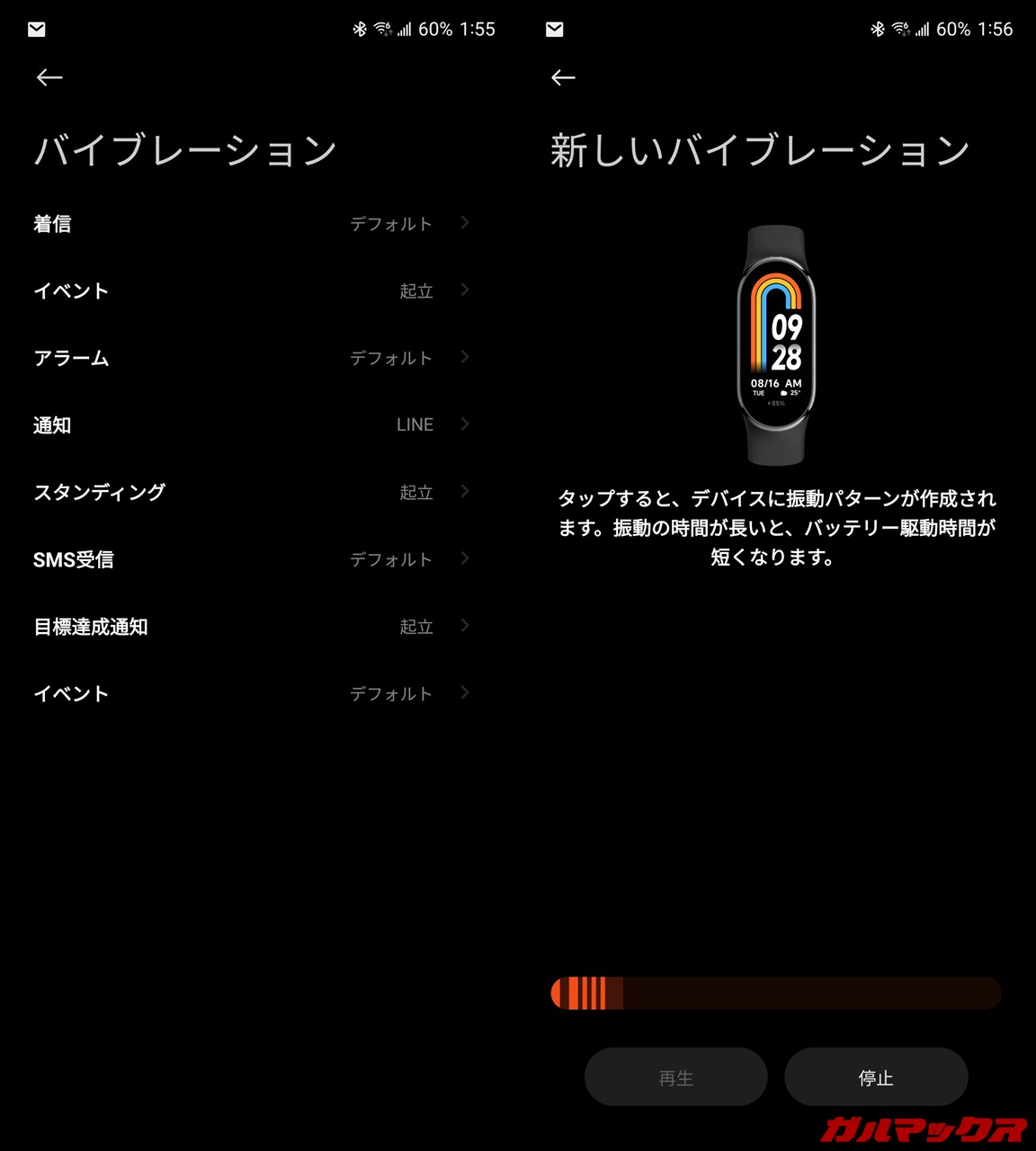 ▼Xiaomi Smart Band 8は通知受信時や目標達成、着信などに応じてバイブ振動パターンを変えられることに加え、そのバイブパターンも自分で自作できるのがGood!↓