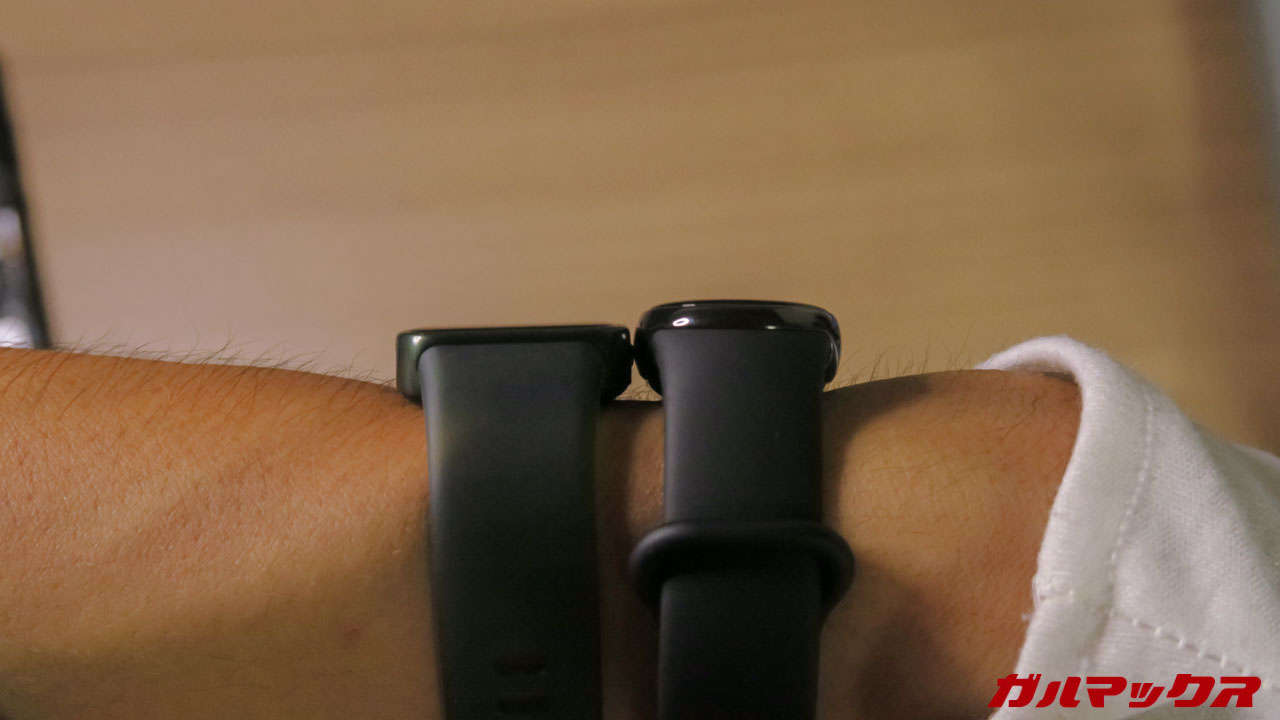 ▼ただ注意点もあって、本体サイズは縦横ともにスマートバンドらしくコンパクトですが、厚みはわりとあります。筆者が買ったHUAWEI Band 8と比較するとこんな感じ。↓