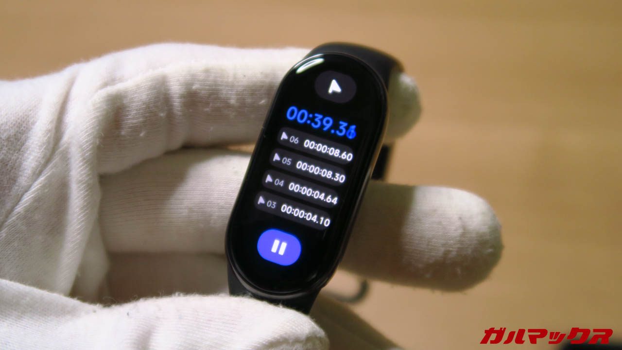 ▼ストップウォッチは操作ごとにバイブフィードバックが起こるのでボタンを押せてるか判別でき、ラップタイムは同時に4つまで表示でき視認性もGood。