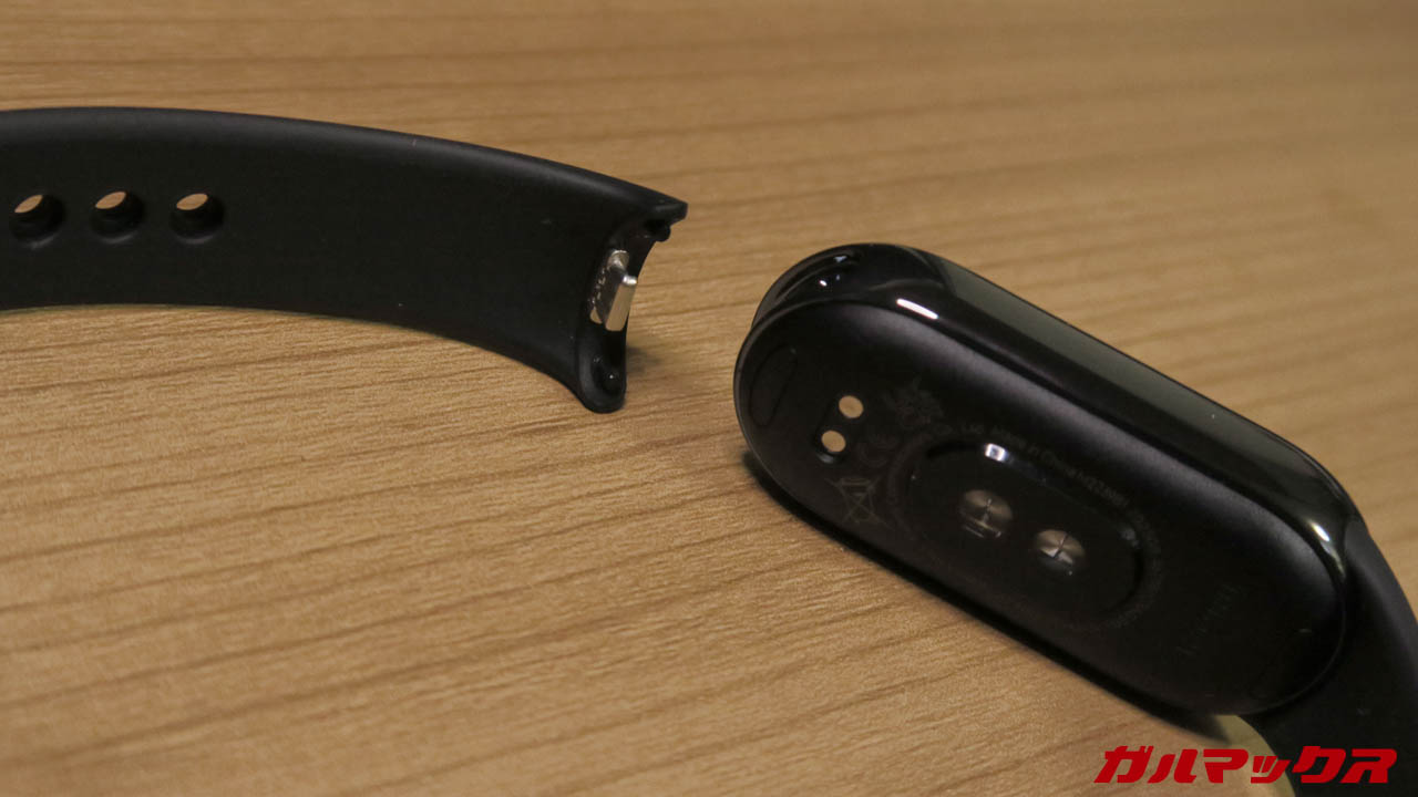 ▼さらにバンドの着脱方式も変更されており、これまでは本体にまるごとラバーバンドをかぶせる方式だったのが、今回より他モデル同様にバンドの上下を単体で付け替える、という方式になってます。本体裏のボタンを押すと‥ハズれます。↓