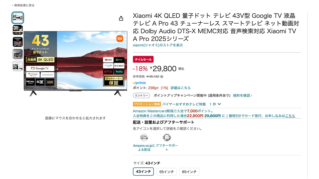 Xiaomiが色んな家電を発表したんだが、発売記念なのか「Xiaomi TV A Pro 43 2025」がトンデモない価格で販売していた。なんと29,800円。いつまでこの価格なのかよく分からんが、執筆時点ではこの価格で注文できる。