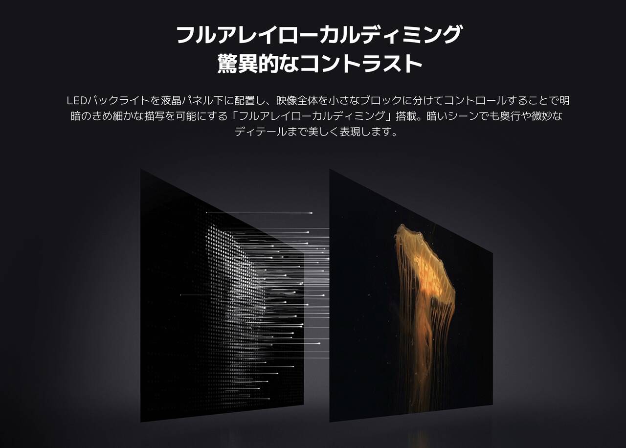 ローカルディミングってのは照らすエリアを細かく分けることで、例えば黒色部分は消灯して黒さを引き締めるようなことができる。
