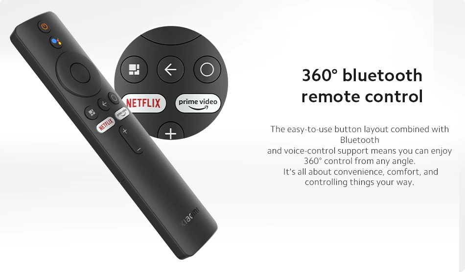 ▼Xiaomi TV Stick 4Kにはリモコンが付属。GoogleアシスタントボタンにNetFlix、Prime Videoのショートカットボタンもついております。Googleアシスタントを使えば調べ物も対応するスマートデバイスの操作もできますぞ。↓