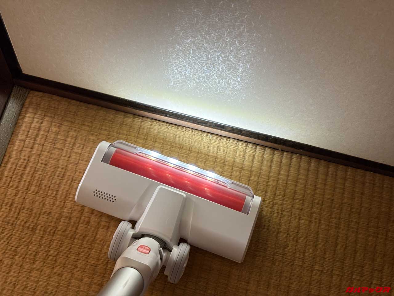角じゃない壁際は全く問題なく吸えるんですが、上の写真のように壁際角になると角部分だけゴミが残ります。なので角の掃除はヘッドを外して吸ってます。