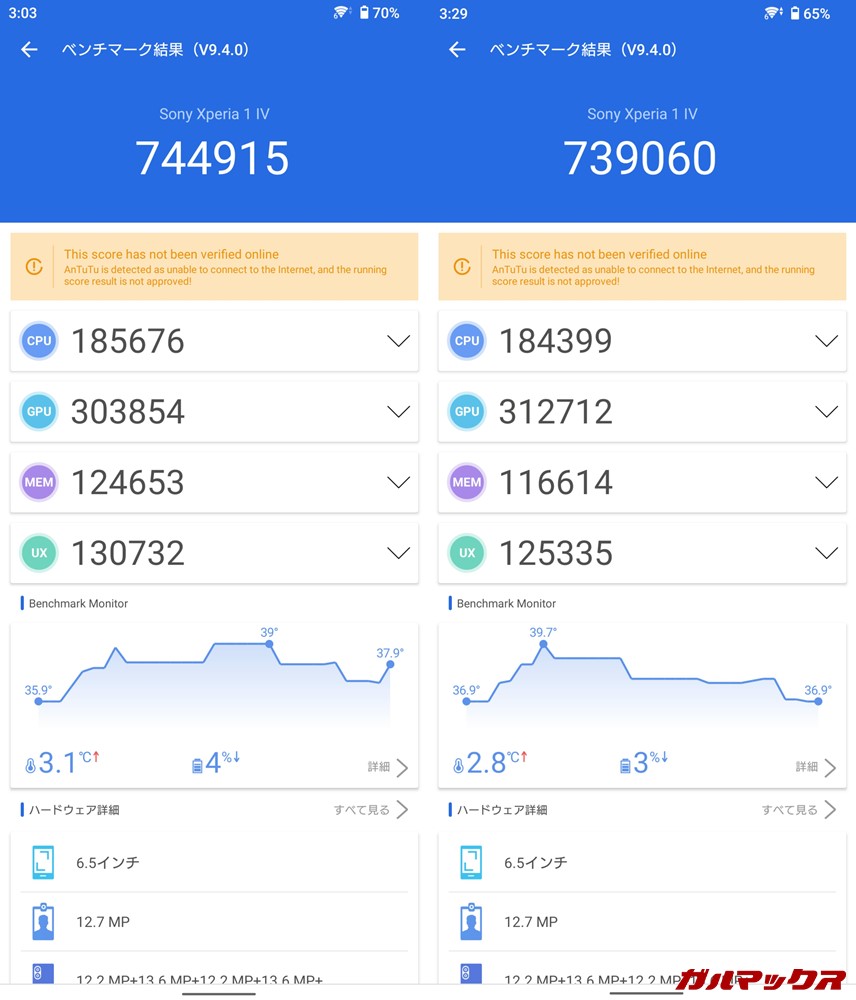 ▼パフォーマンスもモロに発熱の影響を受けます。AnTuTuも連続で回してみたところ、1回目では80万点だったのが、2回めでは74.4万点、3回目では73.9万点にまで落ち込みました。他スマホの連続測定よりも点数変動は激しい。↓