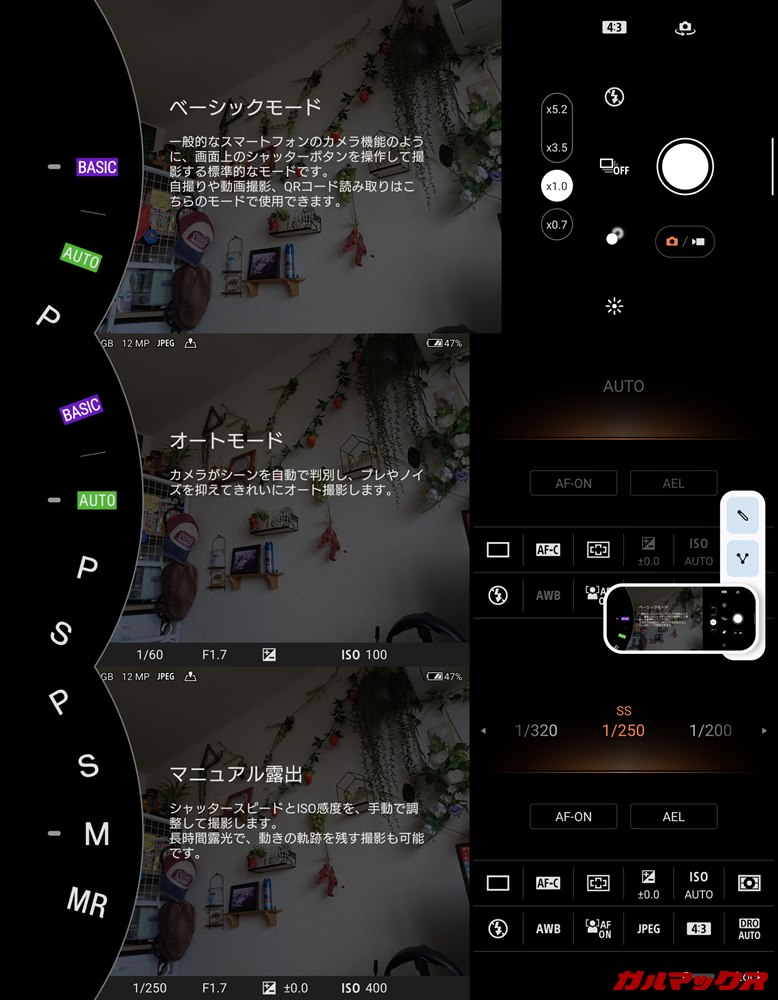 ▼またXperia独自ともいえるのがこの本格的なカメラUI。一般的なスマホのProモードのようなものなのですが、デザインは一眼レフカメラのαシリーズのようにカッコいいですし、調整項目もとっても多くてガチさを感じられます。↓