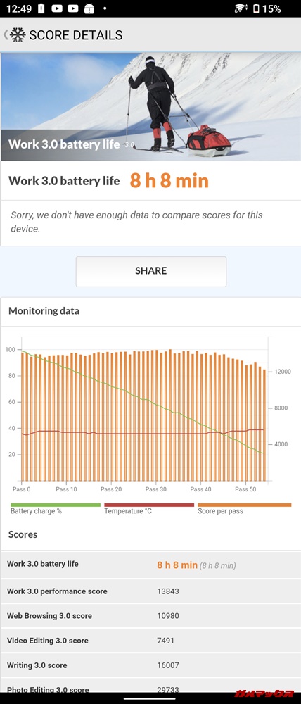 ▼PCMarkでバッテリーテストを行ったところ8時間8分でした。他機種では10時間ぐらいがほとんどでしたが、やっぱ4KディスプレイでハイエンドSoCってのがモロに響いてるんだろうな(´・ω・`)。↓