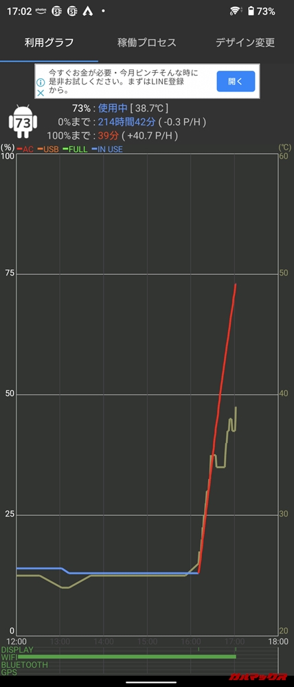 ▼急速充電はどれぐらいの規格に対応しているかは明らかにされていませんが、筆者の持ってる18Wの充電器を試したところ、約50分ほどで60%ほど充電できていました。急速充電器があれば結構充電は早いです。↓