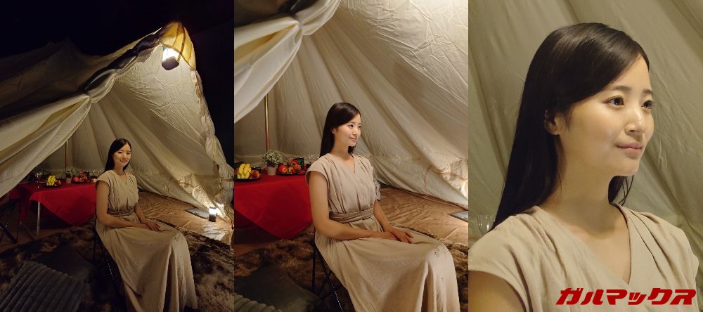 ▼まず明るいシーンでモデルさんを撮影。完全オートモード「BASIC」で撮影しています。左が通常、右が望遠カメラの3.5倍で撮影しています。カメラを変えたときの色合いは若干異なるけど、解像感と色合い、明るさは良好!↓
