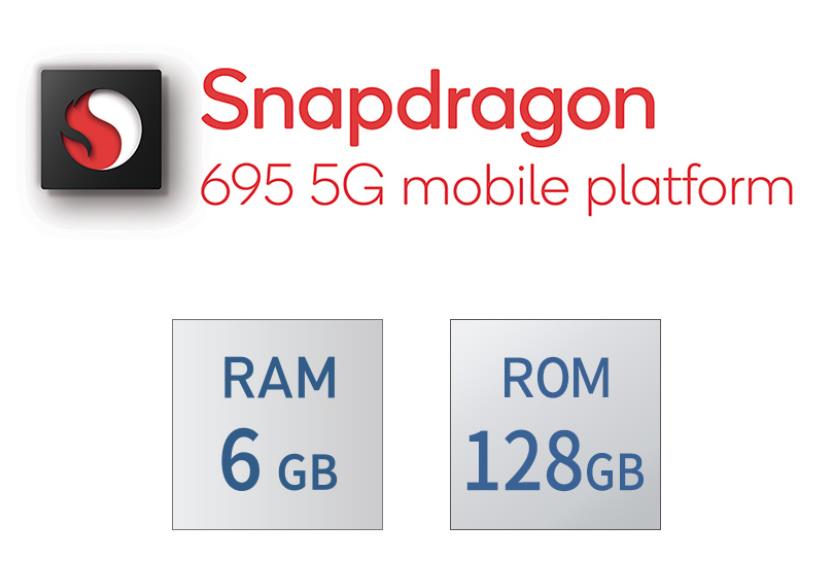 ▼SoCはSnapdragon 695を採用!ミドルレンジ帯なんですが上位に位置する高いスペックを持っています!普段使いも軽いゲームもサクサクいけそう!メモリ(RAM)は6GB、保存容量(ROM)128GBと大容量で攻めてるのもいいっすなぁ。↓