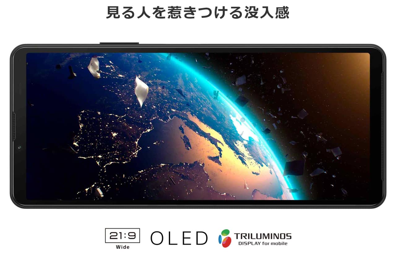 ▼ディスプレイは21:9の超スリムワイドな形状で、先代同様に有機ELを採用しております!さらに先代モデルXperia 10 IIIよりも最大輝度が50%アップしているそうです!ただ高リフレッシュレート記載はないためおそらく非対応でしょう。↓
