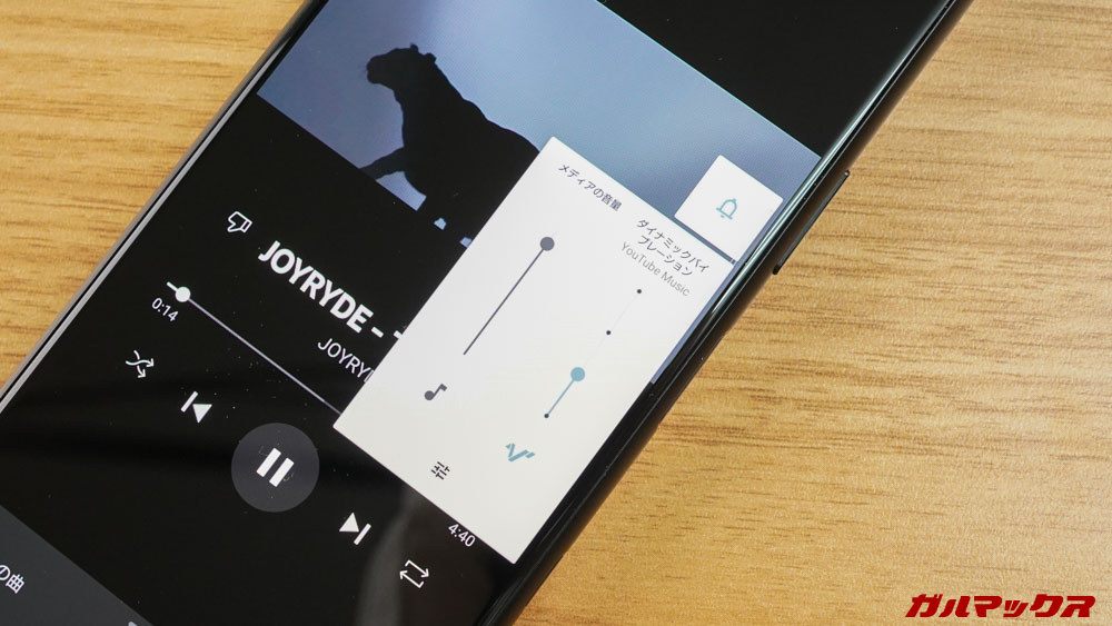 あとXperiaスマホ特有の再生音量に応じて振動させる「ダイナミックバイブレーション」も対応していますが、こちらは音量が大きい間だけ普通に振動するのみでそれほどダイナミックさは感じません。