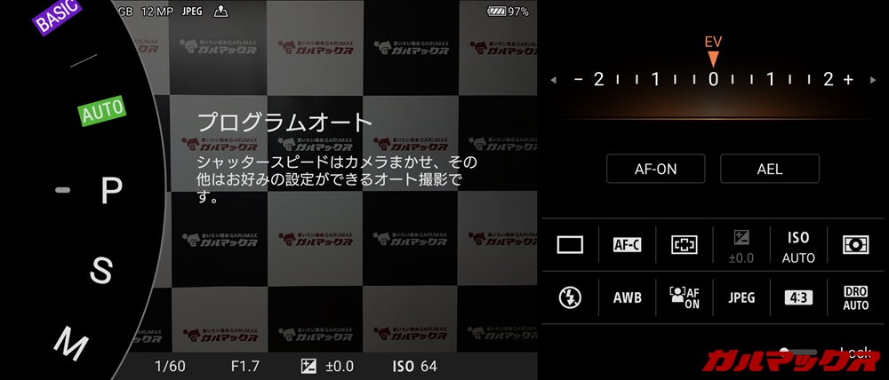 ▼左上から撮影モードの切り替えができ、スマホライクなBASICモード、その他はデジカメのようにオートモードやプログラムオート、完全マニュアルといった切り替えもできるぞ!↓