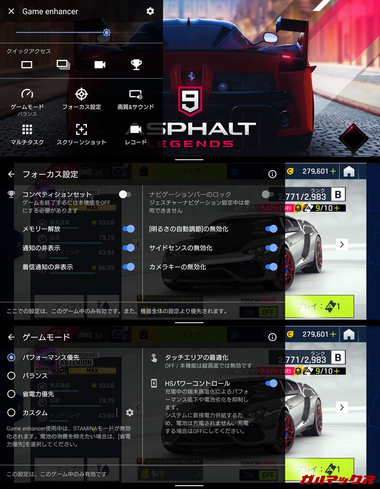 ▼ゲーム中は通知を切ったり録画や画質音質設定を変えたりなど様々なゲーム重視の設定を煮詰められます。思った以上にいろいろ出来る。さらに本体に直接給電してバッテリー負荷を抑える機能も付いてた!これ長時間遊んでも不安にならないやつだ!↓