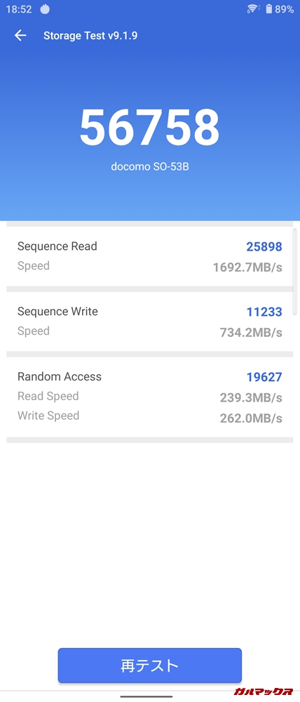 ▼ストレージ速度は読み込みが1692.7MB/s、書き込みが734.2MB/s。さすがハイエンドモデル!とっても早いぜ!↓