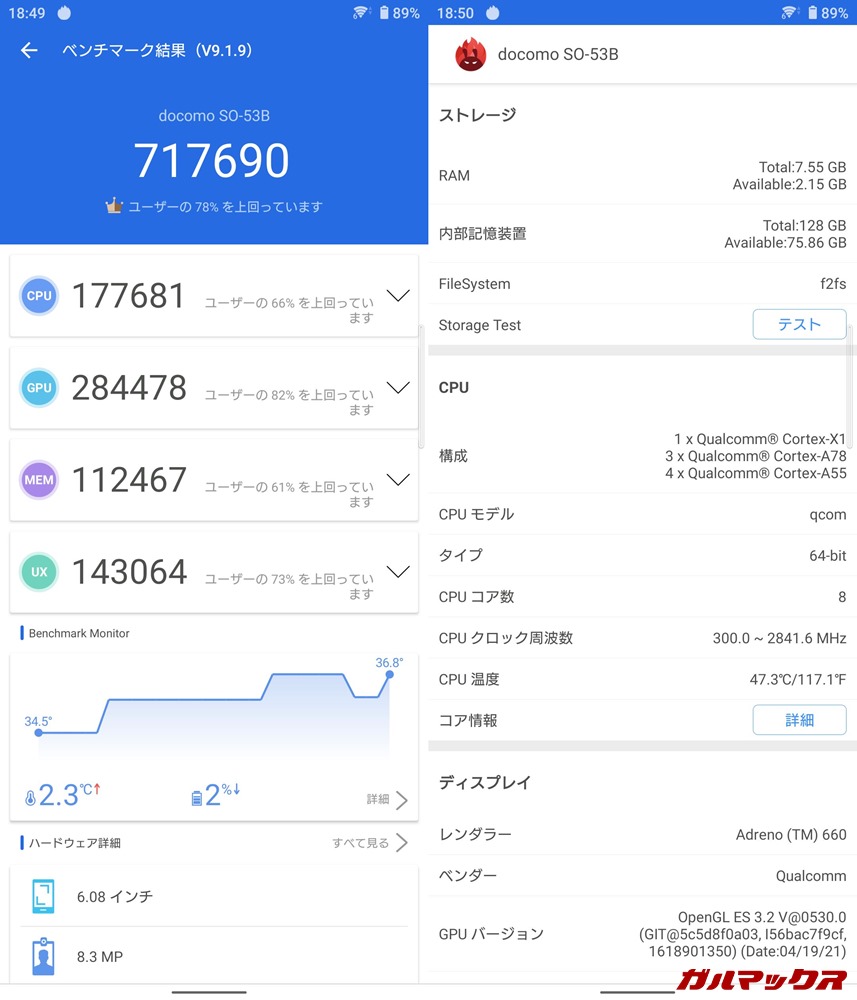 ▼Xperia 5 IIIの実機でAnTuTu(Ver9)を測定しました!総合スコアは717,690点、GPUスコアは284,478点です!↓