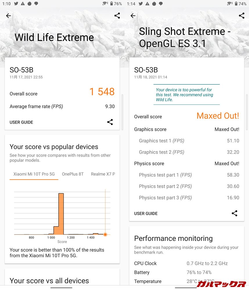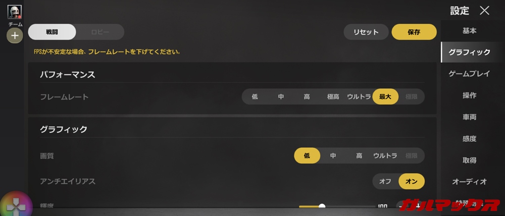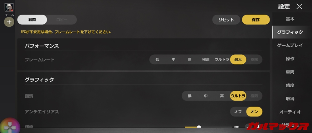 Snapdragon 888だけあって動作も快適。高画質でも極限でフレーム設定が組めるレベルです(玄人好みであればスムーズ+極限で安定とは思いますが…)。
