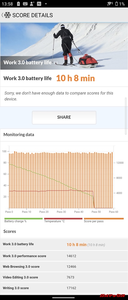 ▼PCMarkのバッテリーテストは以下の通りでした!よう頑張った。↓