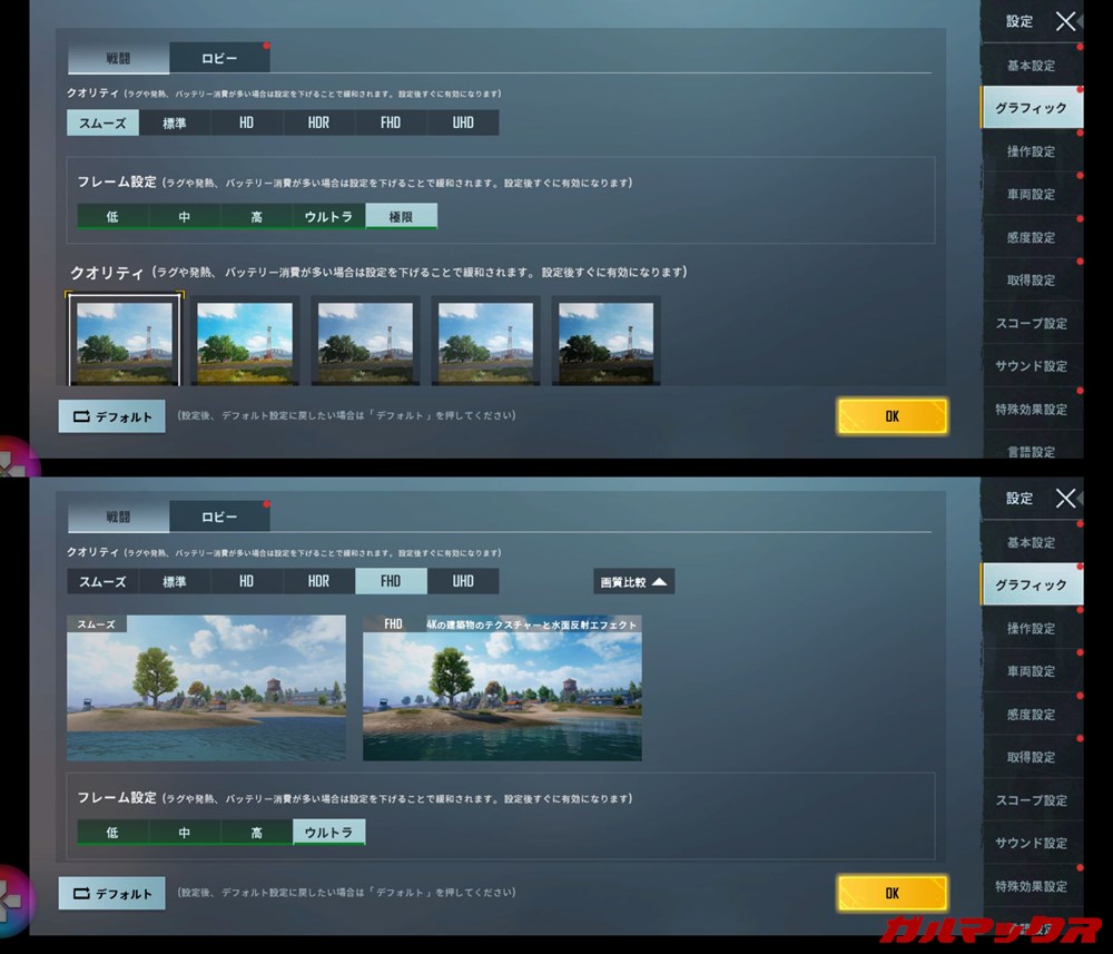 画質はFHDも選べます。ただこの場合はフレーム設定はウルトラに下がります(今のところ、どのスマホでもFHD+極限の組み合わせ自体はできないかも?)