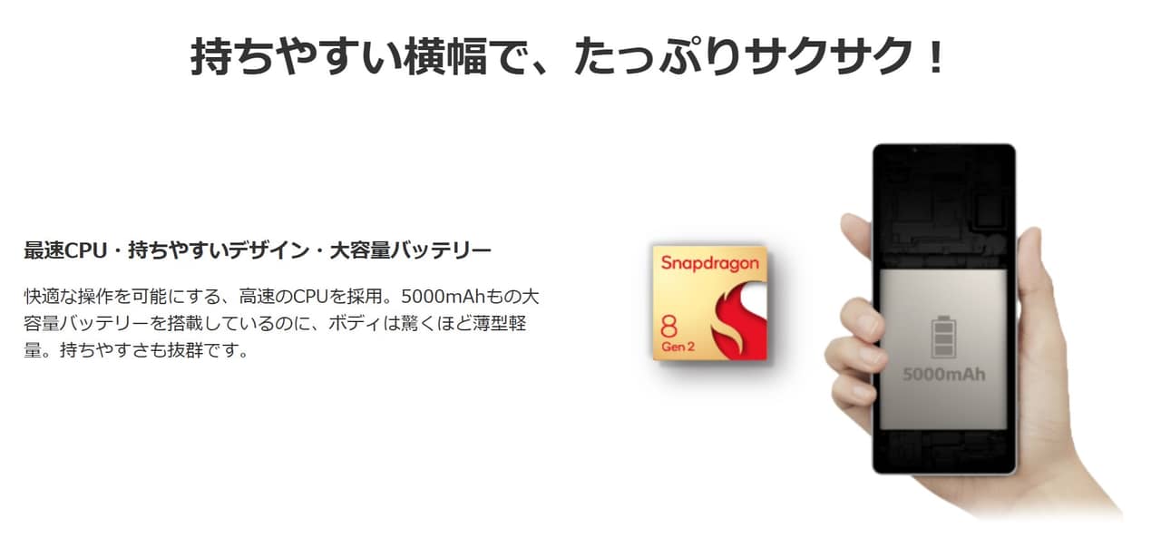 ▼あと本体サイズも高さ154mm、横幅68mmとたいへんコンパクトなのがGoodです!それでいて性能も最強クラスな性能のSnapdragon 8 Gen 2を採用!ちっちゃいのに性能はハイパワーという、まるでアルトワークスやS660みたいなスマホ。↓