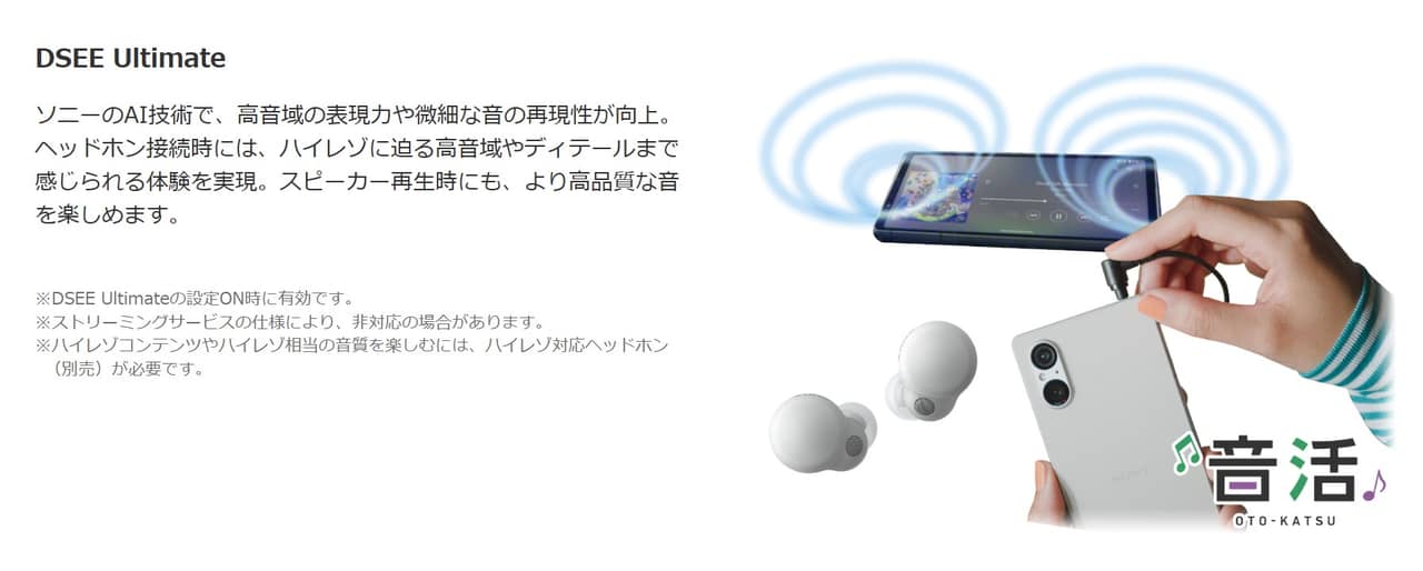 ▼スピーカーは当然デュアルタイプで臨場感と広がりを重視したチューニングを施していたり、DSEEなんちゃらってAI技術でより音の解像感を向上させたりしているとのこと!あとイヤホンジャックもある!↓